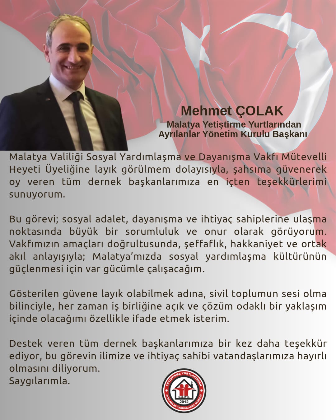 Malatya’da faaliyet gösteren derneklerin geniş katılım gösterdiği seçim sürecinde, Mehmet Çolak sivil toplum kuruluşlarının temsilcisi olarak bir kez daha mütevelli heyetinde yer almaya hak kazandı. Seçimlerin ardından bir teşekkür mesajı yayımlayan Çolak, kendisine duyulan güvenden dolayı tüm dernek başkanlarına şükranlarını sundu.