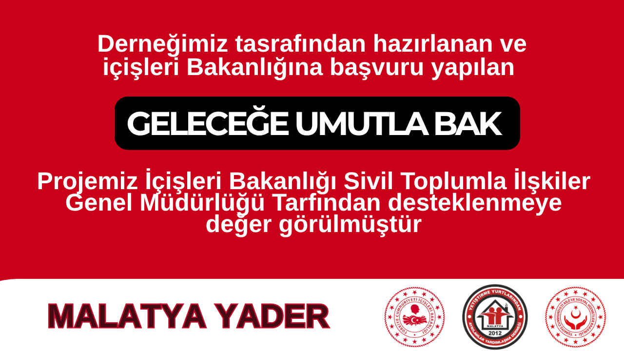 Malatya Yetiştirme Yurtlarından Ayrılanlar Yardımlaşma Derneği (Malatya YADER), devlet koruması altındaki gençlerin geleceğine ışık tutacak "Geleceğe Umutla Bak" projesi için İçişleri Bakanlığı’ndan tam destek aldı.