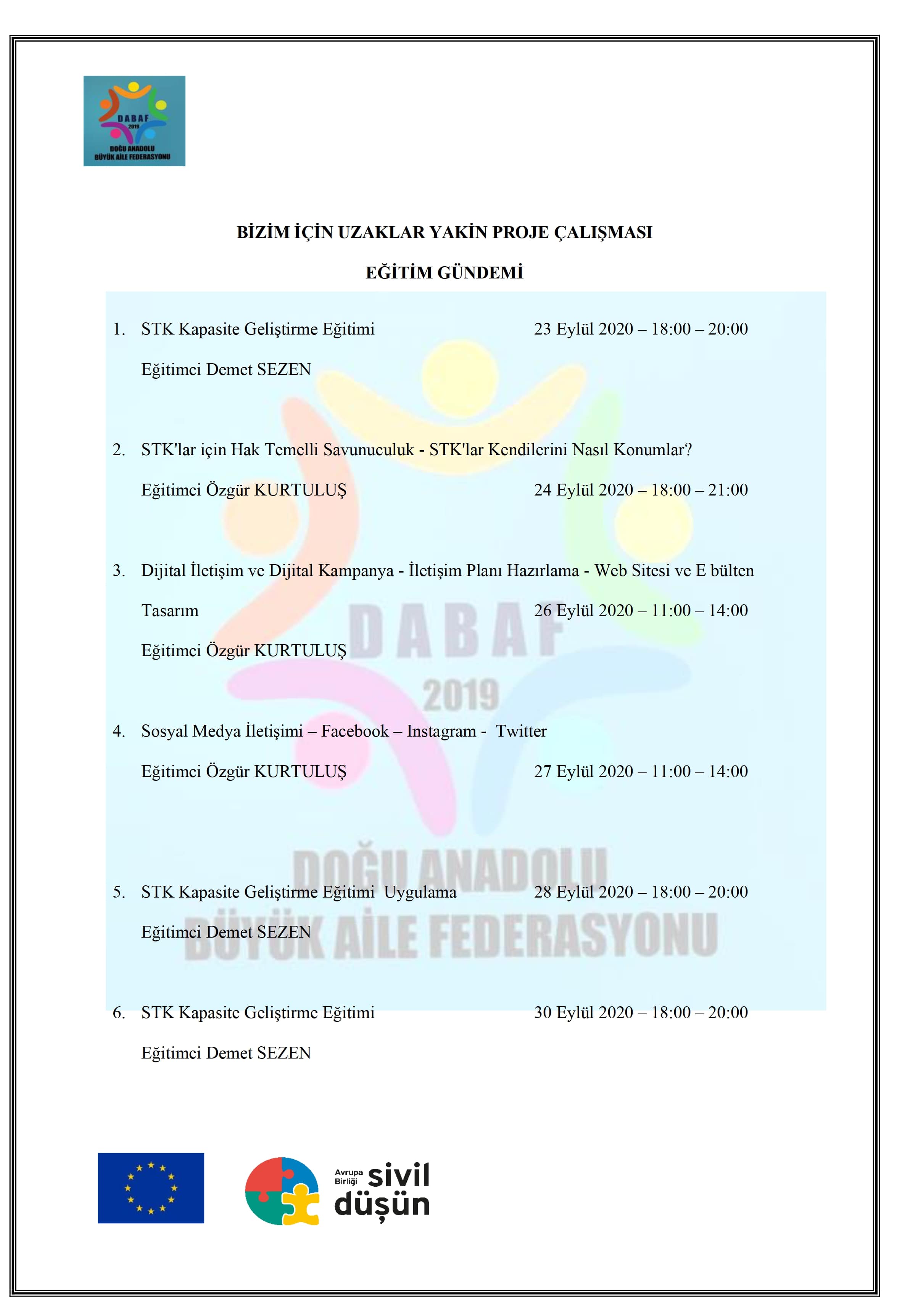 Eylül 2020 dönemi boyunca süren eğitim programına; Malatya, Erzurum, Bingöl, Muş ve Ağrı illerinden dernek yöneticileri, Yurt Sendikaları temsilcileri ve çeşitli uzmanlar katılım sağlıyor. Eğitimlerde, sivil toplumun deneyimli isimleri rehberlik ediyor: