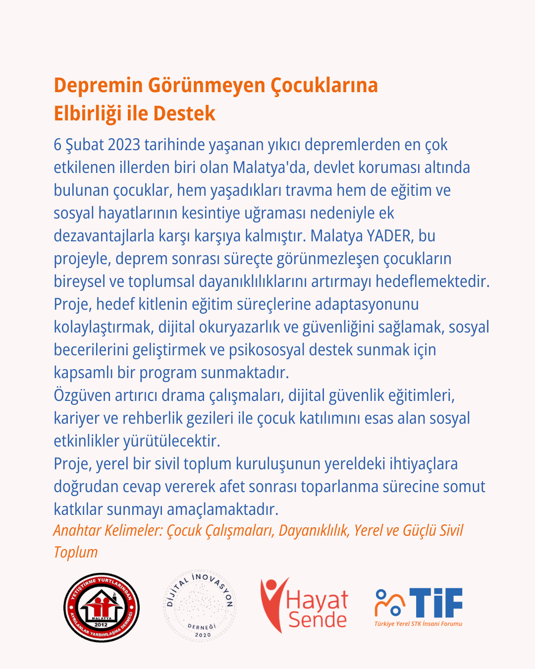 6 Şubat depremlerinden etkilenen Malatya’da, devlet koruması altında yaşayan çocukların psikososyal dayanıklılığını artırmak ve eğitim hayatlarına destek olmak amacıyla hayata geçirilen proje nihayete erdi. Türkiye Yerel STK İnsani Forumu (TİF) ve Hayata Destek Derneği’nin mikro-hibe desteğiyle gerçekleştirilen çalışma, çocukların sosyal ve dijital becerilerini geliştirmeyi başardı.