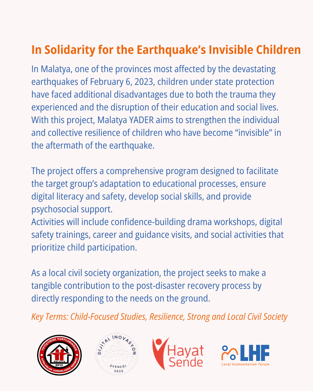 Malatya YADER Başkanı Mehmet Çolak ve proje ekibinin koordinasyonunda yürütülen projede; Hayat Sende Gençlik Akademisi Derneği, Malatya Dijital İnovasyon Derneği ve ilgili kamu kurumlarıyla stratejik iş birlikleri yapıldı. Proje süreci, sadece çocukların gelişimine katkı sunmakla kalmadı, aynı zamanda derneğin afet sonrası kriz yönetimi ve hassas gruplarla çalışma kapasitesini de artırdı.